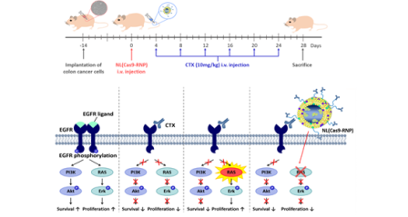우리 학교 윤태종 교수 연구팀이 나노-유전자 가위 기술을 활용해 대장암 치료제를 개발하는 데 성공했다. 현재 널리 쓰이고 있는 대장암 항암제에 치료 효과를 보이지 않는 유전자 변이 대장암 환자들을 위한 치료법이다.윤태종 교수(약학과)는 조영석 가톨릭대 교수(의과대학 내과학교실)와 함께 나노 전달체에 유전자 가위 단백질 구조체를 탑재하는 방식을 통해 유전적 이상 부위를 효과적으로 편집함으로써 새로운 대장암 치료제를 개발하는 데 성공했다고 밝혔다. 관련 내용은 저명 학술지 4월4일자 온라인판에 게재됐다. 논문의 제목은 ‘항암제 내성 대장암을 치료하기 위한 유전자 편집 나노 입자 시스템의 치료적 접근(Gene editing particle system as a therapeutic approach for drug-resistant colorectal cancer)’이다. 윤 교수팀이 개발한 방법은 현재 대장암 치료를 위해 널리 사용되고 있는 약물에 저항성을 가져 치료가 어려웠던 환자들을 위한 것이다. 세툭시맙(cetuximab) 항암제는 대장암 치료를 위해 많이 쓰이고 있지만 암세포의 성장과 관련된 KRAS 유전자의 변이로 인해 치료 효과를 보지 못하는 환자가 많다는 점이 한계로 지적되어 왔다. 대장암은 현대인의 식습관과 생활방식 탓에 지속적으로 발생이 증가하는 질병이다. 때문에 치료제 개발이 매우 활발히 진행되고 있으며, 주로 항체를 기반으로 한 약물이 사용되고 있다. 이 때쓰이는 약물은 EGFR 수용체에 결합, 암세포의 성장과 생존을 억제함으로써 치료 효과를 보인다. 그러나 대장암 환자 중 60% 정도는 약물에 저항을 나타내 더 이상 치료효과를 보이지 않는 것으로 알려져 있다. 이러한 경우는 암세포 성장과 관련된 KRAS 유전자의 변이에 의한 것으로, 관련된 환자들의 경우 예후가 매우 좋지 않다. 많은 연구자들이 KRAS 유전자 변이에 의한 암을 치료하기 위해서 노력하고 있으나, 유전자 변이로 인해 지속적으로 암이 재발하면서 근본적 치유 방법에 대한 연구가 요구되어 왔다. 때문에 유전자 가위 기술유전자 가위 기술을 활용하는 것이 대안으로 제시되어 왔으나, 단백질 형태의 유전자 가위 소재가 체내에서 안정성이 크게 저하되어 효율성 문제의 해결이 쉽지 않았다. 이에 윤태종 교수 연구팀은 나노 전달체에 유전자 가위 단백질 구조체를 탑재하여 유전적 이상 부위를 효과적으로 편집함으로써, 높은 치료 효과를 거둘 수 있음을 밝혀냈다. 연구팀은 나노 리포좀 구조체나노를 사용하여 KRAS 유전자 변이 부위를 편집할 수 있는 유전자 가위 단백질 소재를 탑재했다. 또한 이 나노 구조체 표면에 대장암 표적을 위한 항체를 도입함으로써, 유전자 가위 소재의 안정성과 치료 효과를 극대화할 수 있음을 확인했다. 생체 내 실험(in vivo)에서 암조직으로의 유전자 가위 소재 전달 효율은 60%에 달했으며, 동물 모델에서의 치료 효과는 대조군 대비 높은 치료 효과를 보였다. 윤태종 교수는 “기존 유전자 형태의 유전자 가위 소재는 바이러스 전달체를 이용, 생체에 적용하는 구조로 전달 효율이 낮고, 원치 않는 부위까지 편집하게 되는 부작용(off-target 효과)이 문제였다”며 “이에 대안으로 단백질 구조체로 이뤄진 유전가 가위 소재가 부상했지만, 생체 내 주입 이후 효소들에 의해 분해되면서 전달·편집 효율이 낮아 한계를 보여 왔다”고 설명했다.이에 윤 교수 연구팀은 생체 적용이 가능한 소재로 이뤄진 나노 구조체를 발굴해 적용했다. 유전자 가위 기술을 이용해 유전자적 문제 부위를 편집하면 근본적 치료 가능성이 높아지나, 체내 주입 시 안정성이 떨어졌던 문제를 극복해낸 것. 윤 교수는 “지금 현재는 암 치료를 위해 시험관 환경(in vitro)에서 면역 세포의 활성을 조절하는 수준의 유전자 가위 기술이 사용되고 있다”며 “앞으로는 직접 체내 주사를 통해 치료 효과를 극대화할 수 있을 것으로 기대한다”고 전했다. KRAS 유전자 변이에 의한 암은 대장암뿐 아니라 췌장암, 폐암, 난소암 등 많은 암 질환과 관련되어 있어, 치료가 어려운 암 질환의 극복을 위해서는 나노-유전자 가위 기술에 대한 연구가 더욱 긴요하다.윤태종 교수는 지난 20여 년간 다양한 바이오 물질을 효과적으로 세포나 조직에 전달할 수 있는 나노 소재를 연구해온 전문가다. 최근에는 유전자 가위 기술의 한계로 지적되어 온 ▲낮은 체내 안정성과 세포 침투율 ▲국부 치료가 불가능하다는 문제점 등을 극복하고자 나노 기술을 접목하는 연구에 집중해 왔다. 윤 교수는 우리 학교 산학협력단 산하의 엔포유 기술지주회사 ㈜무진메디의 대표를 맡고 있고 이 회사를 통해서 임상 시험을 진행할 계획이다.