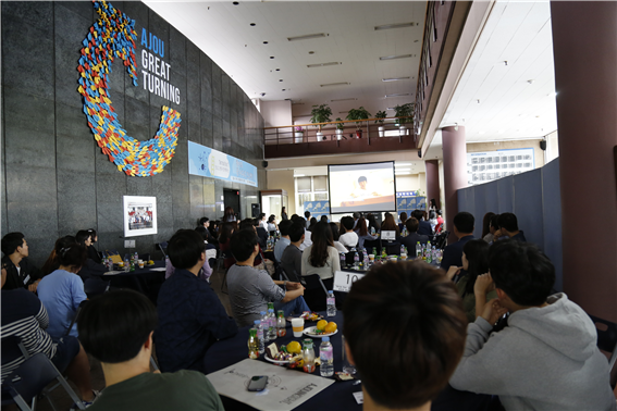 올해 여름 진행된 첫 번째 ‘AFTER YOU- 2015 아주 글로벌 캠퍼스’를 마무리하는 행사가 18일 오후 율곡관 로비에서 열렸다. 이날 행사에는 ‘AFTER YOU 프로그램’ 참가자들과 인솔 직원, 보직교수를 비롯한 교직원 뿐 아니라 청야 회원들이 함께 자리했다. 청야는 어려운 환경 탓에 야간 고등학교나 야간 대학을 다니며 스스로 자신의 길을 만들어간 사람들의 모임으로 이번 프로그램 참가자들과 멘토로서 지속적으로 교류해왔다. ‘AFTER YOU 프로그램’ 미시간대학 참가자인 문수진 학생(정외 14)의 사회로 진행된 이날 행사는 대학별 인솔자의 참가 후기 발표로 시작됐다. 미시간대학에 다녀온 김지선 주임(인문대학 교학팀)과 존스홉킨스대학에 다녀온 박성숙 계장(공과대학 교학팀), 상해교통대학 인솔자 김도연 씨(국제교류팀)가 발표했다. 학생 대표로는 미시간대학 참가자 이반석(경영 10), 장종환(경영 11), 서아륜(기계 11), 송보석(성균관대 신소재공학과 10) 학생이 발표에 나섰다. 상해교통대학 참가자 강동호(문화콘텐츠 11), 김솔(경영 11) 학생과 존스홉킨스대학 참가자 이상명(문화콘텐츠 13), 김민정(산업공학과 14), 오창열(문화콘텐츠 12) 학생도 현지에서의 생활과 이 프로그램 참여를 통해 느낀 점에 대해 발표했다. 이후 기부자와 멘토들께 보내는 감사의 글 낭독과 멘토와의 대화가 이어졌다. 본 행사가 끝난 뒤에는 성호관 앞 잔디밭에서 멘토들과 함께 하는 비어파티가 계속됐다. 행사에 함께 한 김동연 총장은 "오랜 공직생활, 그리고 정책학도로서 공부하는 동안 계속 가졌던 고민이 '정책 목표'를 실현하기가 쉽지 않다는 점"이라며 "여러분들의 오늘 발표를 들어보니, 'AFTER YOU 프로그램'은 기획의도와 취지가 정말 잘 구현된 사례라는 생각이 든다"고 전했다. 김 총장은 이어 "'AFTER YOU 프로그램' 을 통해 도전과 배려라는 덕목이 아주대의 울타리 밖으로도 널리 펴져 나갔으면 한다"며 "용감하고 씩씩한 아주인이 되기를 기대한다"고 덧붙였다. 'AFTER YOU 프로그램- 2015 아주 글로벌 캠퍼스'는 어려운 환경 탓에 해외 체류 경험을 쌓기 어려웠던 학생들을 위해 만들어진 프로그램이다. 참가자들은 미국 미시간대학과 존스홉킨스대학, 중국 상해교통대학에서 올 여름방학 4주 동안 고강도의 교육을 받고 돌아왔다. 미시간대학과 상해교통대학 참가자들에는 참가비용 전액이, 존스홉킨스대학 참가자들에게는 참가비용 60%가 장학금으로 지원됐다. 재원은 이 프로그램의 취지에 공감하는 외부 인사들의 기부로 마련했다.