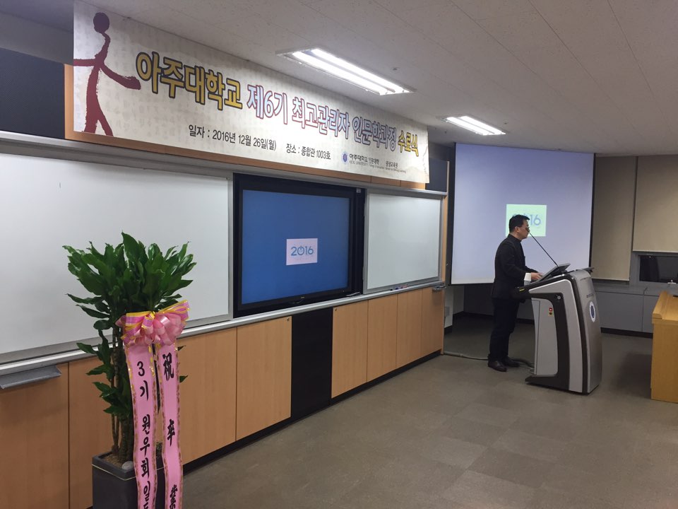 ‘인문학으로 혁신하고 실천하다’12월 26일, 제6기 최고관리자 인문학과정이 13주간의 여정을 끝내고 수료를 맞이했다.제6기 최고관리자 인문학과정은 ‘혁신과 실천’을 주제로 공사기업의 최고경영자, 정부 인사, 금융·법조·의료 등 전문직 종사자 등을 대상으로 △공통 테마가 있는 강의 △나를 찾는 고전텍스트 공부 △인문 경영능력 함양 등의 교육 과정을 진행하였다.이번 수료식에는 6기 최고과정 원우 13명을 비롯하여 1~5기 원우 5명과 박만규 인문학아카데미아원장, 이성엽 평생교육원장, 박구병 사학과 교수 등 관계자가 수료식에 참석하여 자리를 빛내주었다. 수료식은 박만규 인문학아카데미아원장의 격려사, 이성엽 평생교육원장의 축사, 수강 소감 발표 등으로 진행되었으며 6기 원우 20명이 수료하였다. 또한 부단히 6기 원우회를 이끌어준 홍순만 회장, 김기범, 김희선 부회장 및 반용달 총무가 공로상을 수상하였으며, 성실히 수업에 참석하여 타의 모범이 되어준 윤영선 최고과정 원우가 특별상을 수상하였다.신풍건설중기 대표이사이자 이번 6기 회장인 홍순만 원우는 “6기 최고관리자 인문학과정 원우들이 오늘 이 자리를 기점으로 동문회의 구심점이 될 수 있기를 기원하며, 이 좋은 과정에 끝까지 함께 할 수 있어서 영광입니다” 고 수강소감을 밝혔다.제7기 최고관리자 인문학과정은 17년 3월에 개강하며 자세한 사항은 아주대학교 인문대학(031-219-2801), 평생교육원(031-219-1565)으로 문의하면 된다.