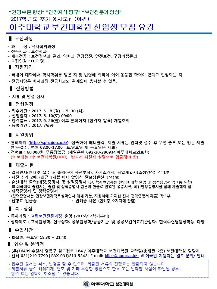 [재공지][보건대학원] 2017학년도 후기모집 안내