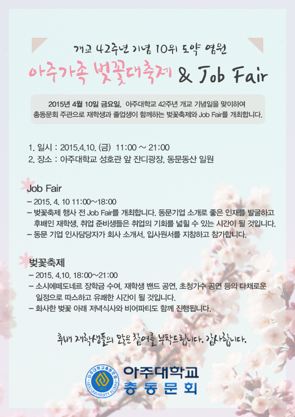 [ 아주가족 벚꽃 대축제 & JOB Fair 초청/ 아주대총동문회 ] - 개교42주년 기념, 대학평가 10위권 도약 염원!