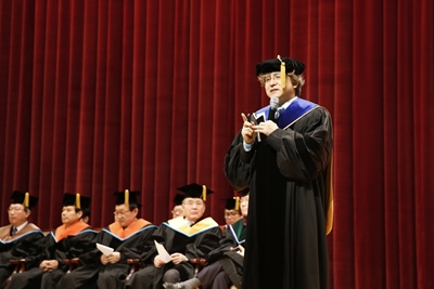 박형주 총장이 2018학년도 신입생들과 첫 만남을 가졌다. 박 총장은 23일 체육관에서 열린 2018학년도 입학식에 참여해 축사 대신 특강으로 신입생들을 환영했다. 특강은 약 20분 남짓 진행됐다. 강연은 ‘지식의 시대는 저물었다’는 도발적인 메시지로 시작됐다. “21세기는 지식과 정보가 과다하게 생산되고 지식의 유통기한이 짧아진 시대이므로 통찰이 중요해졌다”고 설명한 뒤, 수학과 간호학을 접목해 크림전쟁에서 영국정부의 변화를 이끌어낸 나이팅게일과 빅데이터를 이용해 패션산업의 패러다임을 바꾼 ZARA의 설립자 오르테가를 사례로 들어 ‘통찰’의 중요성을 강조했다. 이어서 박 총장은 “4차산업의 핵심은 이미 존재하는 기술을 연결하는 것”이라며 “지식의 양이 아닌 학습능력이 미래경쟁력이 될 것이다”고 예견했다. 그리고 “대학에서 꾸준한 ‘생각연습’을 통해 ‘배움의 즐거움’을 터득해야 된다”고 조언하며 강연을 마무리했다. 입학식 본식이 끝난 이후에도 박 총장은 끝까지 남아 공연과 교육을 지켜봤다. 앞선 21일에도 편입생 오리엔테이션에 참가하는 등 학생들과의 만남을 계속 이어가고 있다.