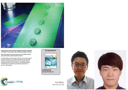 우리 학교 심태섭 교수(화학공학과·에너지시스템학과)연구팀이 콜로이드 광결정 박막을 이용한 실시간 미세압력 센서를 개발했다.심태섭 교수는 지난 6일 새 연구 성과가 미세유체공학 분야 저명학술지인 11월 표지 논문으로 선정됐다고 20일 밝혔다.논문 제목은 이다.이번 연구에서 심태섭 교수 연구팀의 최장한 학생(에너지시스템학과)은 미세압력 변화에 변형되어 광신호 변화를 야기하는 박막 콜로이드 광결정 멤브레인을 미세유체소자에 결합하고, 소자내에 가해지는 0.01 psi 수준의 미세한 압력변화를 감지함으로써 내부압력의 실시간 모니터링이 가능함을 입증했다. 심태섭 교수는 "전기에너지를 전혀 소모하지 않으면서 국부적인 미세압력 변화를 정교하게 측정할 수 있다는 것을 보인 결과"라며 "미세한 수력학적 거동 및 화학반응 뿐만 아니라 몸 안에서 일어나는 미세한 생체신호 변화 등의 모니터링을 위한 소재로 응용이 확산될 수 있을 것"이라고 말했다.